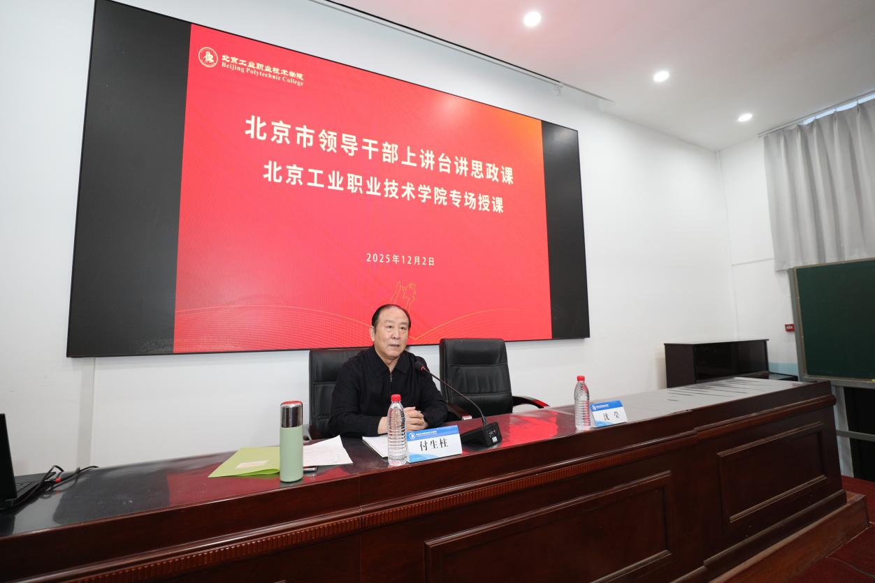 2025年12月2日下午,“北京市领导干部上讲台讲思政课北京工业职业技术学院专场授课”在学校厚德楼阶梯教室举行。本次活动特邀石景山区人大常委会原副主任付生柱担任主讲人,以“认真学习党史 赓续红色血脉”为主题开展授课。党委书记田红芳、马克思主义学院和相关职能部门负责人、教师代表、学校2025年青马班学员等共同参加了此次学习。活动由党委常委、副院长沈莹主持。