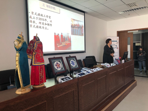 活动当天张老师提前来到现场并在现场展出了许多旗袍文创作品。活动一开始张老师先简单的做了自我介绍,随即张老师向同学们介绍了京式旗袍的特色,“京式旗袍”制作面料取材织锦缎、古香缎、绸。制作采用盘、绣、镶、拼和镂等传统手工艺,根据个人特点量体裁衣,并多运用各种技法凸显其立体感。发展至今已有一百多年的历史,是近代中国女性服装的代表作。接下来张老师向同学们介绍自己开设的工作室以及相关经历,张老师在讲述工作室特色的同时也为同学们灌输着创新创业的知识和理念,通过讲述自身旗下工作室的运作模式,主要运营项目及特点,让同学们对创新创业中最主要的核心竞争力有了一定的理解。她向同学们展示了自己为多国领导人定制的特色京式旗袍以及相关的文创产品,如《万事如意》、冬奥北京外事礼物《瑞雪》、赠与外交部的《中式手袋》、台办礼物《心相映》等。京式旗袍拥有极高的艺术价值和复杂多变的表现形式,既可以是端庄优雅的正装,又可作为华丽高贵的礼服。她希望可以让每一位女生都有一件专属自己的旗袍,并希望可以将京式旗袍推广出去,让更多人听闻、了解、喜爱上京式旗袍,真正理解这份老北京独有的文化遗产,并且将其传承下去,张老师响应国家有关弘扬优秀传统文化的号召,积极参与各项国内外文化交流活动,推出特色文创产品,开展相关培训课程,让京式旗袍再现绝世芳华。