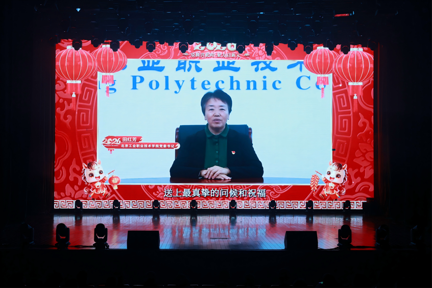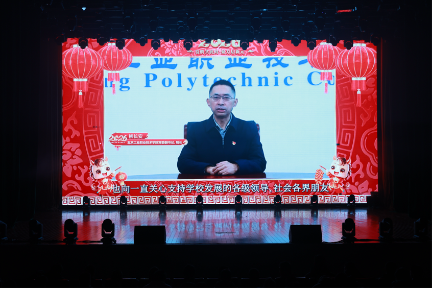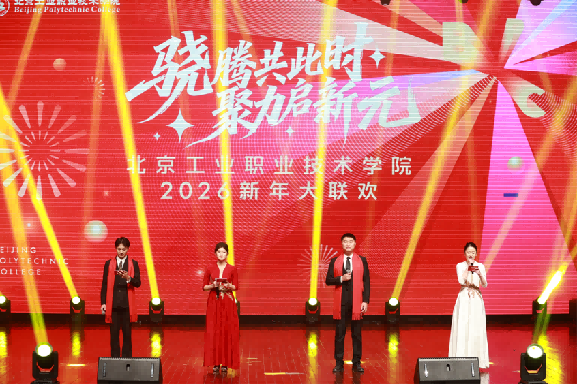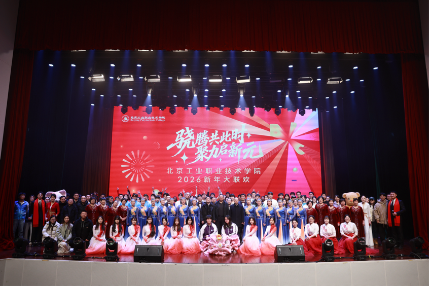 时光荏苒,华章日新。在2026年新年即将到来之际,为凝聚师生力量、丰富校园文化底蕴,12月26日中午,北京工业职业技术学院“骁腾共此时,聚力启新元”2026新年大联欢在校园隆重举行。校党委书记田红芳,党委副书记魏晓东,党委常委、纪委书记钱伟,党委常委、副院长史运涛,党委常委、副院长高世吉,党委常委、院长助理谢光辉等学校领导与全校师生千余人欢聚一堂,在歌舞欢腾中回望奋斗岁月,在青春激昂中奔赴崭新征程。
