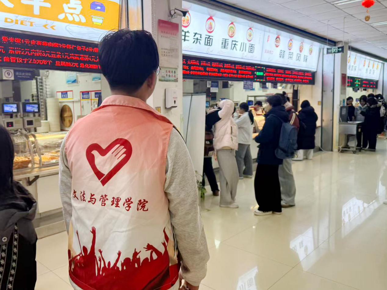 与此同时,12名青年志愿者于中午12:00—12:30准时奔赴校园食堂一、二、三楼,开展就餐秩序维护志愿服务。面对用餐高峰人流,志愿者们分工明确、响应迅速,在各楼层取餐窗口、通道关键点位坚守岗位,主动引导师生有序排队、文明取餐。