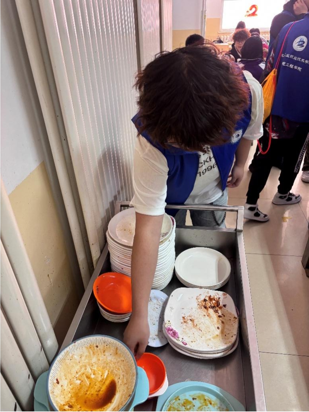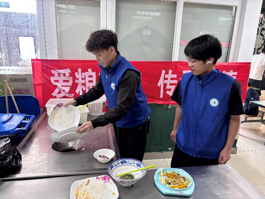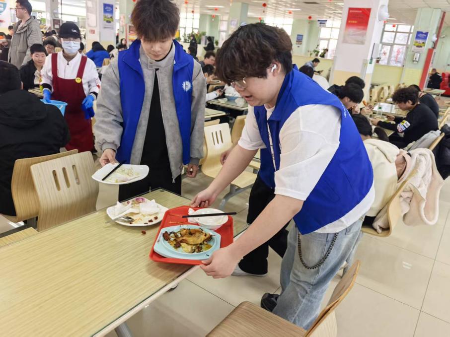 中午时分,学院机蓝志益服务队的志愿者们准时出现在学校食堂。协助食堂工作人员整理残食台,将餐桌上的餐盘、碗筷分类回收。他们用实际行动倡导文明用餐,也为营造整洁、有序的就餐环境贡献了一份力量。