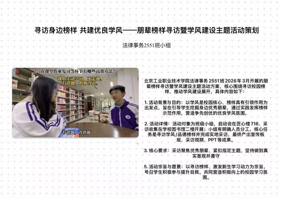 3月11日,基础教育学院开展“寻访身边榜样 共建优良学风”主题活动,鼓励学生挖掘身边优秀学生典型,通过榜样分享、事迹宣传等形式,以朋辈榜样的示范力量传递优良学风,带动全体学生对标先进、勤学善思、互帮互助,将外在学风要求转化为内在学习自觉,形成“学习榜样、争当榜样”的争先创优良好学风生态。