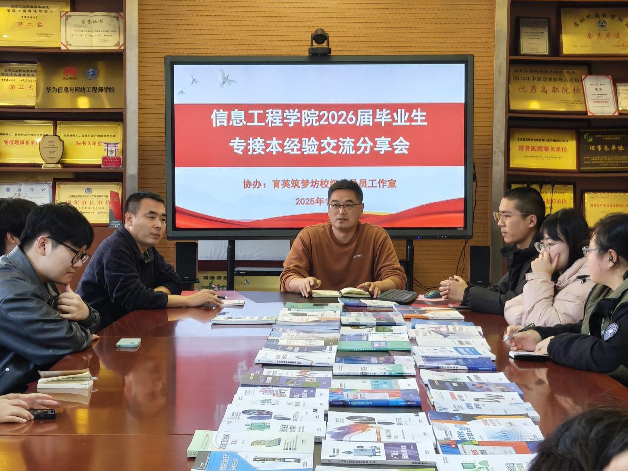 12月5日下午,信息工程学院于创新楼308会议室举办“朋辈引领,逐梦启航”2026届毕业生专升本经验交流分享会,“育英筑梦”辅导员工作室协办。学院党总支副书记刘同师出席,2025届优秀毕业生韩梦乐、马锦程、冯敬伊三位同学分享备考经验。活动由韩瑞刚老师主持。