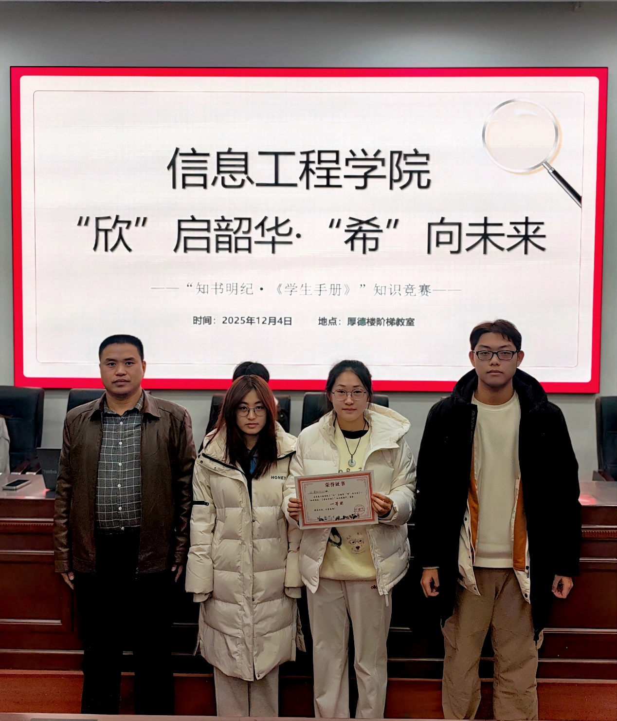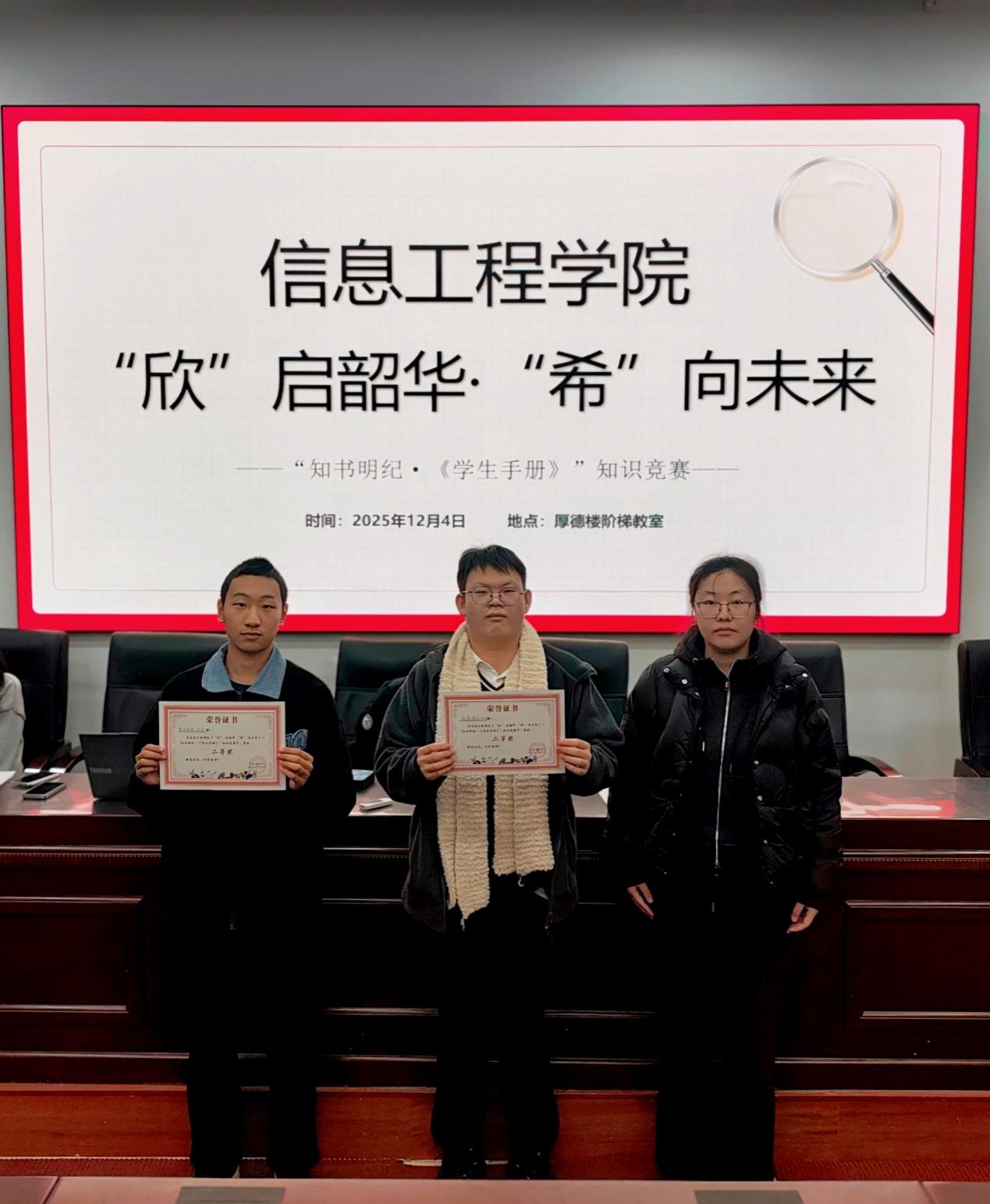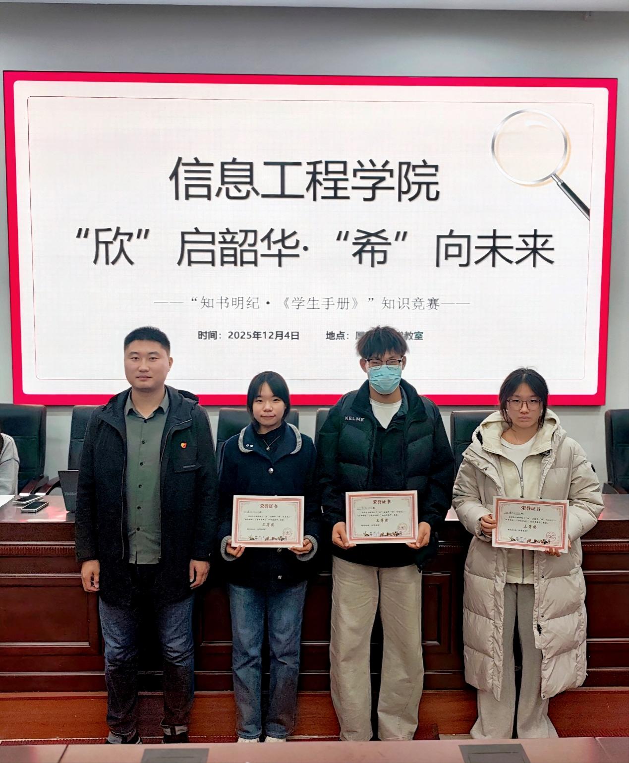 2025年12月4日,信息工程学院“欣”启韶华“希”向未来—“知书明纪《学生手册》”知识竞赛决赛在厚德楼阶梯教室顺利落幕。经过多轮角逐,动漫制作2521班代表队荣获一等奖,电子信息2531班、信息安全2531班代表队获二等奖,动漫制作2531班、动漫(中日)2532班、人工智能2532班代表队获三等奖。